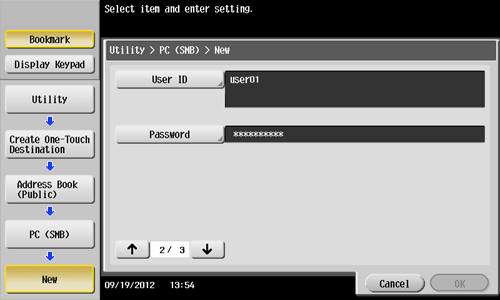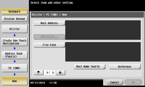 Tap [Utility] - [One-Touch/User Box Registration] - [Create One-Touch Destination] - [Address Book (Public)] - [PC (SMB)] - [New].