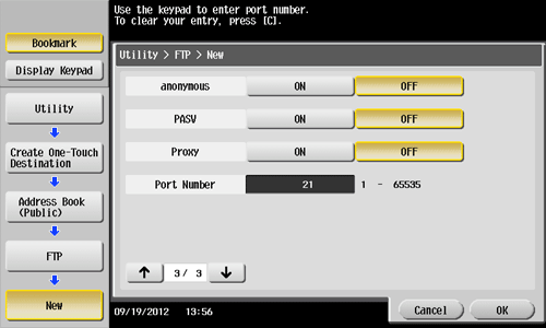 Tap [Utility] - [One-Touch/User Box Registration] - [Create One-Touch Destination] - [Address Book (Public)] - [FTP] - [New].