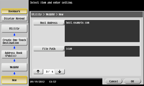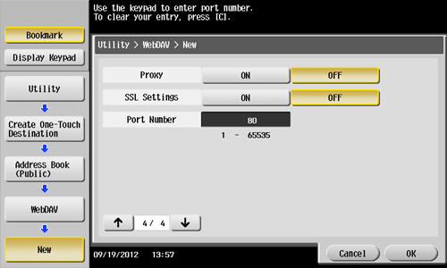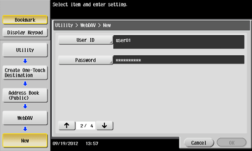 Tap [Utility] - [One-Touch/User Box Registration] - [Create One-Touch Destination] - [Address Book (Public)] - [WebDAV] - [New].