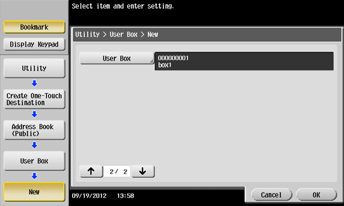 Tap [Utility] - [One-Touch/User Box Registration] - [Create One-Touch Destination] - [Address Book (Public)] - [User Box] - [New].
