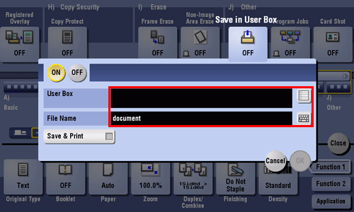 Select [Application] - [Other] to set [Save in User Box] to [ON], and tap the input area or the list icon of the [User Box].