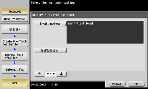 Tap [Utility] - [One-Touch/User Box Registration] - [Create One-Touch Destination] - [Address Book (Public)] - [Internet Fax] - [New].