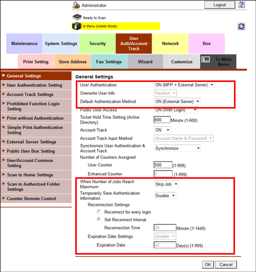 In the administrator mode, select [User Auth/Account Track] - [General Settings], then configure the following settings.