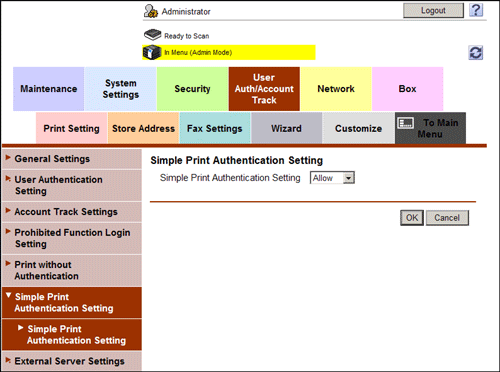 In the administrator mode, select [User Auth/Account Track] - [Simple Print Authentication Setting] - [Simple Print Authentication Setting], and then set [Simple Print Authentication Setting] to [Allow] (Default: [Restrict]).