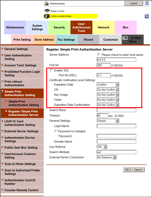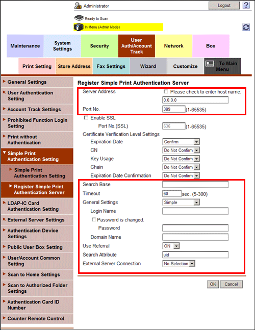 In the administrator mode, select [User Auth/Account Track] - [Simple Print Authentication Setting] - [Register Simple Print Authentication Server] - [Edit], then configure the following settings.