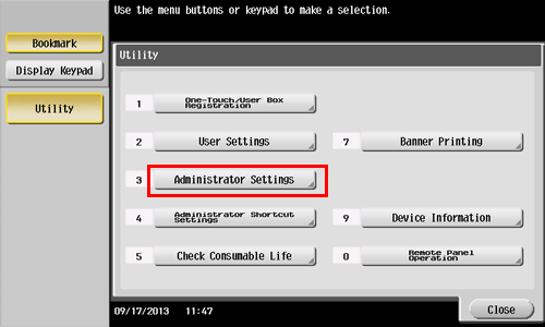 [Administrator Settings] | This button displays items that can be changed only by the administrator. To configure settings, you need to enter the administrator password for this machine. You can specify the initial operations of the copy, print, fax, or User Box function, power saving function, and network function to suit your requirements. Also, you can manage the use status of this machine or inhibit an information leakage by specifying the authentication or security function. |
