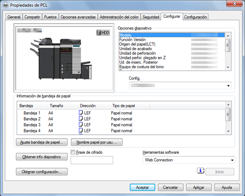 Si la comunicación OpenAPI es cifrada SSL y es posible obtener información del dispositivo de forma automática desde el controlador de impresora, la frase de cifrado puede obtenerse desde esta máquina. Para obtener más información sobre cómo cifrar la comunicación OpenAPI con SSL, consulte Aquí.