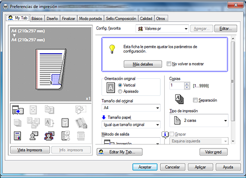 Puede reunir elementos de configuración de distintas fichas y colocarlos en [My Tab]. Mediante el registro en [My Tab] de elementos de configuración utilizados frecuentemente, puede cambiar ajustes en una sola ficha, sin tener que desplazarse entre varias fichas.