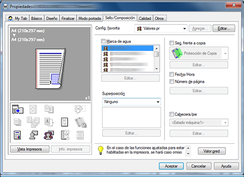 [Imprimir imagen de dispos.] (PCL solamente) | Una imagen de superposición registrada en esta máquina se recupera y se imprime en el original a modo de imagen compuesta. Haga clic en [Editar...] para añadir o eliminar una imagen de superposición o para cambiar el método de composición de imágenes de superposición. Para obtener más información, consulte Aquí. | |