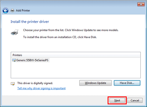 Aparece el cuadro de diálogo para [Instalar el controlador de impresora].
