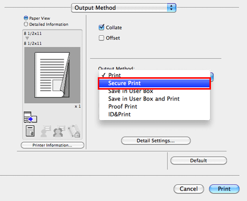 En [Output Method:], en la ventana [Output Method], seleccione [Secure Print].