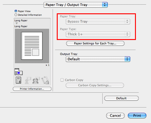 Compruebe que [Paper Tray:] de [Paper Tray / Output Tray] esté ajustado a [Bypass Tray] y que [Paper Type:] esté ajustado al tipo de papel deseado ([Thick 1+]/[Thick 2]/[Thick 3]), y también que estén en gris para evitar que se modifiquen.