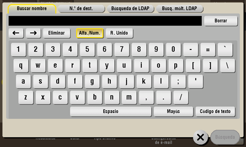 Toque [N.º de dest.] - [Búsqueda] - [Búsqueda de LDAP] o [Búsq. múlt. LDAP].