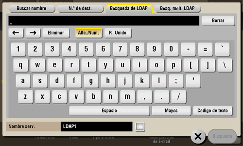 Existen dos formas de realizar la búsqueda: [Búsqueda de LDAP], donde se busca una dirección de correo electrónico por medio de una única palabra clave y [Búsq. múlt. LDAP], donde se busca una dirección de correo electrónico por medio de una combinación de palabras clave de diferentes categorías.