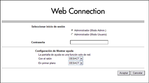 Se ofrecen dos modos de inicio sesión de Web Connection: el "modo Administrador" que se utiliza para configurar los ajustes de esta máquina y el "modo Usuario" que permite utilizar las funciones de esta máquina.