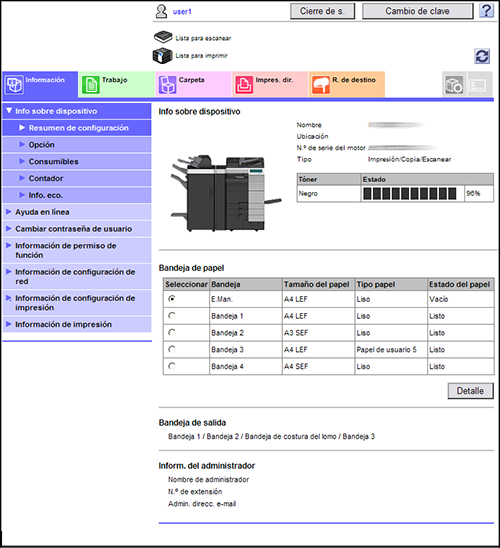 [Administrador (Modo Usuario)] | Permite al administrador de esta máquina iniciar sesión como un usuario en calidad de administrador. Cuando inicia sesión en esta máquina en este modo, no puede cambiar los ajustes de esta máquina. Para iniciar sesión, debe introducir la contraseña del administrador de la máquina. En este modo, puede eliminar tareas. | |