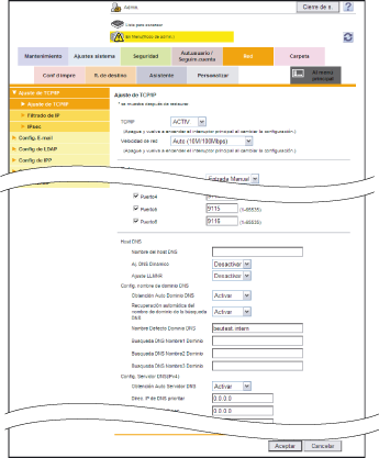 [Nombre Defecto Dominio DNS] | Si no se configura automáticamente el ajuste utilizando DHCP, especifique el nombre predeterminado de dominio de esta máquina (utilizando 253 bytes como máximo, incluido el nombre de host. Solo se permiten - y . como símbolos). |