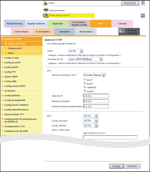 En el modo administrador, seleccione [Red] - [Ajuste de TCP/IP] - [Ajuste de TCP/IP] y, a continuación, ajuste las siguientes opciones.
