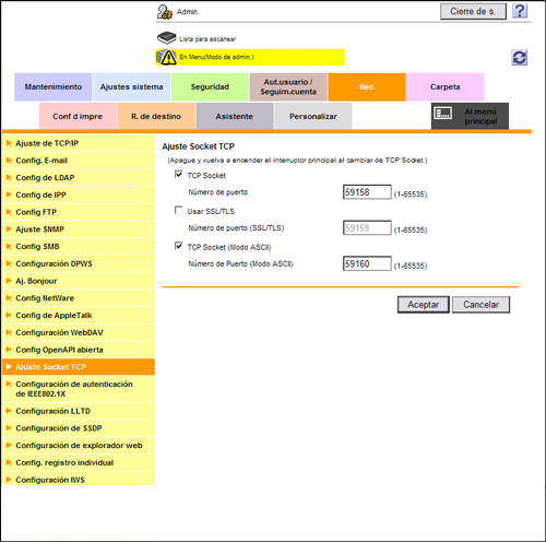 En el modo administrador, seleccione [Red] - [Ajuste Socket TCP] y, a continuación, configure las siguientes opciones.