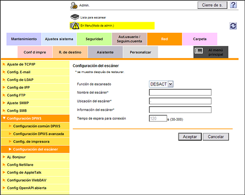 En el modo Administrador, seleccione [Red] - [Configuración DPWS] - [Configuración del escáner] y, a continuación, configure las siguientes opciones.