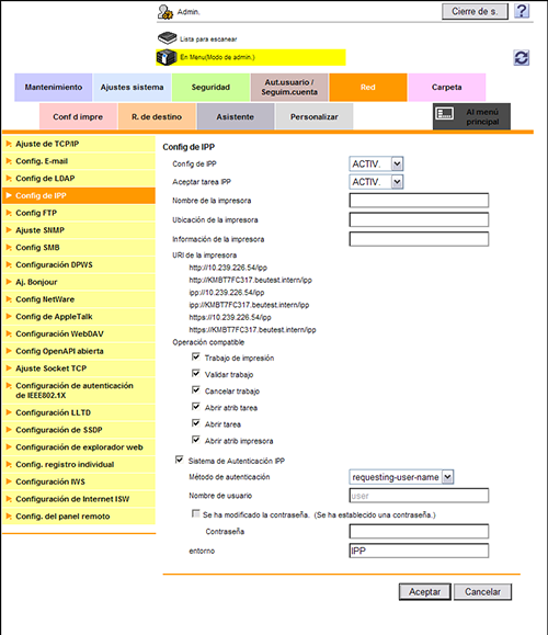 En el modo Administrador, seleccione [Red] - [Config de IPP] y, a continuación, configure las siguientes opciones.