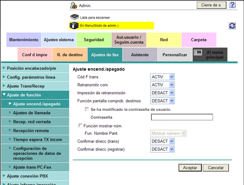 En el modo Administrador, seleccione [Ajustes de fax] - [Ajuste de función] - [Ajuste encend./apagado] y, a continuación, configure las siguientes opciones.