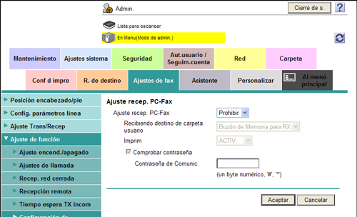 [Ajuste recep. PC-Fax] | Seleccione [Permitir] para utilizar la función Recepción de PC-Fax. [Prohibir] es la opción predeterminada. |