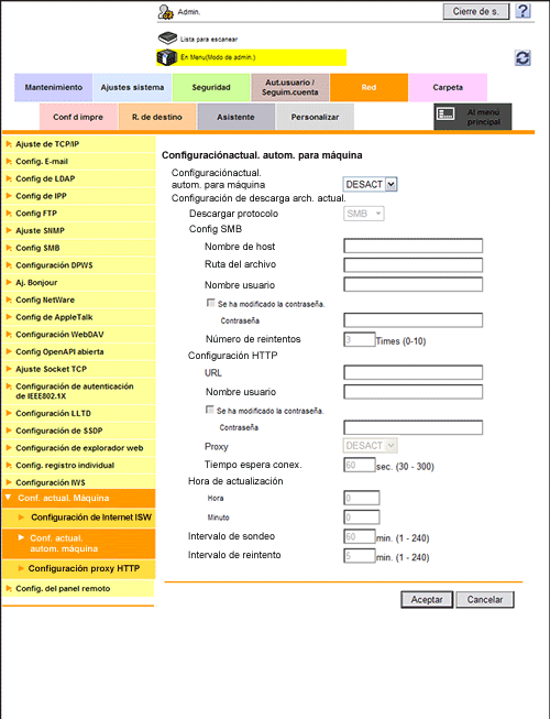 En el modo Administrador, seleccione [Red] - [Conf. actual. Máquina] - [Conf. actual. autom.