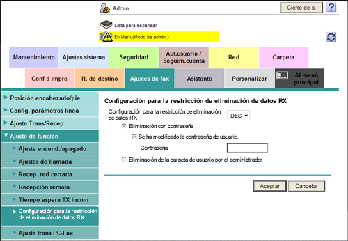 En el modo Administrador, seleccione [Ajustes de fax] - [Ajuste de función] - [Configuración para la restricción de eliminación de datos RX] y, a continuación, configure las siguientes opciones.