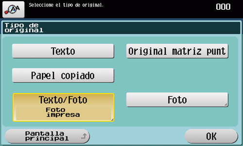 [Texto] | Toque este botón para escanear un original, que conste principalmente de texto, al nivel óptimo de calidad de imagen. Esta función acentúa los bordes de cada carácter, lo que da lugar a imágenes fáciles de leer. |
