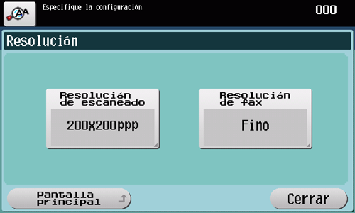 [Resolución de escaneado] | Seleccione la resolución del original para la transmisión de escaneado. Para utilizar Transmisión de correo electrónico, Transmisión SMB, Transmisión FTP, Transmisión WebDAV o Guardar en carpeta de usuario, se selecciona la siguiente resolución para escanear el original.
