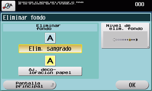 [Nivel de elim. fondo] | Toque este botón para ajustar la densidad del color de fondo para un original con un fondo en color. Seleccionando [Auto] se determinará automáticamente la densidad del color de fondo y se escaneará el original al nivel óptimo de densidad de fondo. |