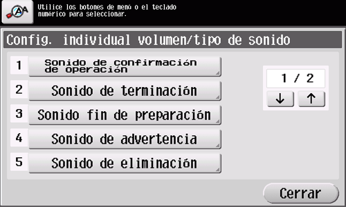 Especifique el tipo de sonido y el volumen para cada uno de los siguientes sonidos: [Sonido de confirmación de operación], [Sonido de terminación], [Sonido fin de preparación], [Sonido de advertencia], [Sonido de eliminación] y [Sonido de autenticación]. Si se ha seleccionado [Configuración por lotes], todos los tipos de sonido y volumen se configurarán a la vez. Seleccione entre seis tipos de sonido y ajuste el volumen a [Alto], [Medio] o [Bajo]. Si se ha seleccionado [Configuración individual], todos los tipos de sonido y volumen se configurarán por separado. |