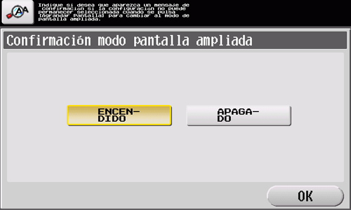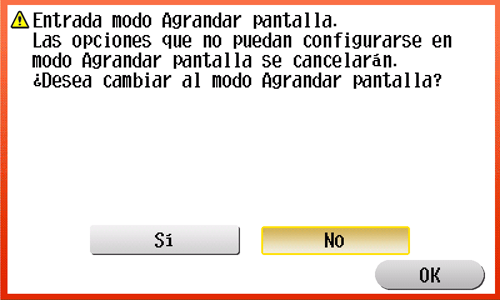 Si no se realiza ninguna operación con la máquina durante un tiempo, el modo de pantalla ampliada se cancela automáticamente. Cuando sea necesario, muestre la pantalla siguiente para confirmar que se debe cancelar el modo de pantalla ampliada.