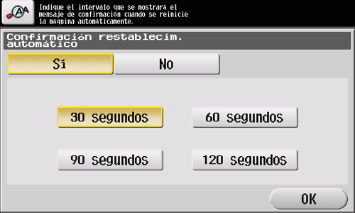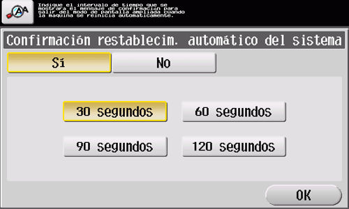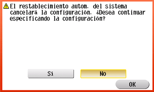 Si no se realiza ninguna operación con la máquina durante un tiempo, la configuración se reinicia automáticamente. Cuando sea necesario, visualice la pantalla siguiente para verificar si se debe restablecer la configuración.
