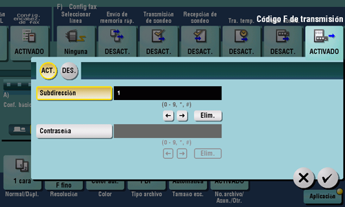 [ACT.]/[DES.] | Seleccione [ACT.] para especificar Código F de transmisión. |