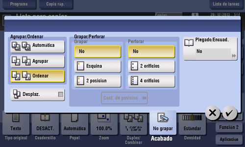 [Perforar] | Seleccione la posición de encuadernado al perforar hojas. Para obtener más información, consulte Aquí. |