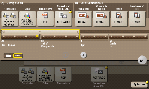 [App] | Configura las opciones de la aplicación para notificar el almacenamiento de los datos del archivo por correo electrónico, para modificar la información del remitente del fax y otras. |