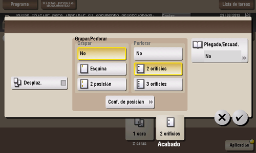 [Conf. de posición] | Seleccione una posición para perforar. Si la posición de perforación se ha ajustado a [Auto], la posición para perforar se determina de forma automática en función de la dirección del archivo de impresión. |