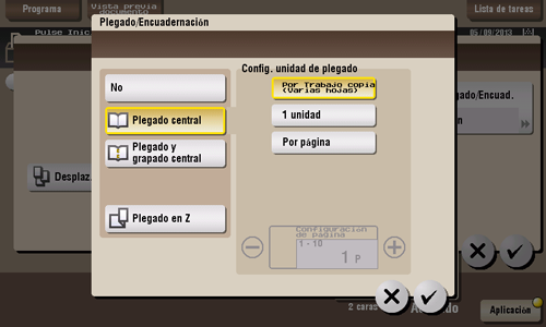 Se obtiene una hoja impresa plegada en dos. Seleccione también la Unidad mediante la cual se pliega el papel en [Por Trabajo copia (Varias hojas)], [1 unidad] y [Por página]. Al configurar [Por página], especifique el número de páginas que deben plegarse al mismo tiempo.