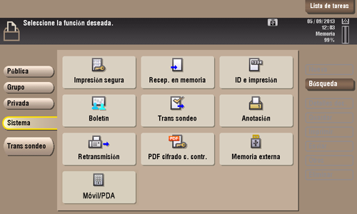 Los documentos de fax necesarios para realizar un sondeo se almacenan en la carpeta de usuario de transmisión por sondeo. Una vez que ha abierto la carpeta de usuario, puede seleccionar un documento de fax almacenado en la carpeta de usuario y previsualizarlo, imprimirlo o eliminarlo. Si los documentos de fax se almacenan en la carpeta de usuario de transmisión de sondeo, los destinatarios pueden realizar sondeos y recibir documentos de fax de esta carpeta cuando sea necesario. Se requiere el kit de fax opcional en la máquina para utilizar esta función. |