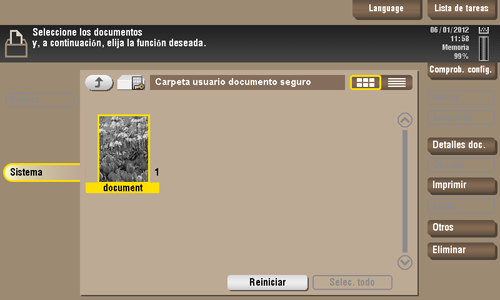Cuando imprime un documento desde el PC o selecciona la función Impresión segura utilizando el controlador de impresora, este archivo de datos se almacena en la carpeta de usuario de impresión segura. Una vez que ha abierto la carpeta de usuario, puede seleccionar un archivo almacenado en esta carpeta y previsualizarlo, imprimirlo, renombrarlo o eliminarlo.