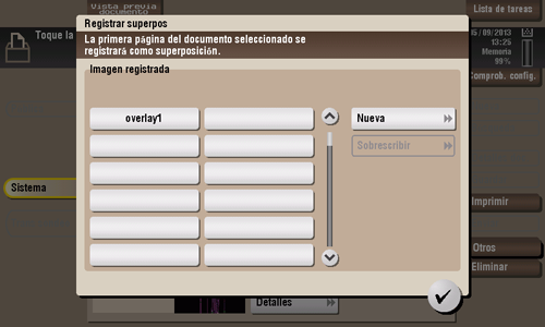 [Nueva] | Permite registrar una nueva imagen de superposición. Para registrar una imagen de superposición, seleccione una tecla sin registrar y toque [Nueva]. |