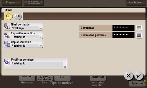 Si el tipo de archivo se ha ajustado a [PDF] o [PDF compacto], es posible cifrar los archivos PDF.