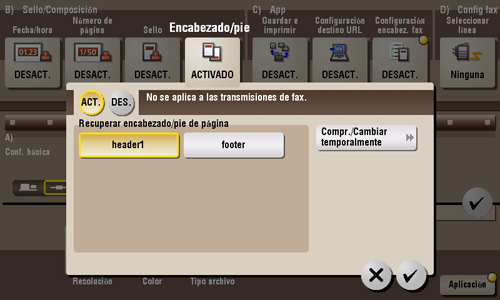 [ACT.]/[DES.] | Seleccione [ACT.] para imprimir el encabezado/pie de página. |