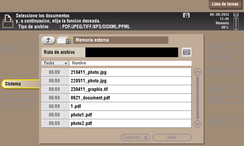 Una vez que ha abierto la carpeta de usuario, puede imprimir un archivo almacenado en una memoria USB. Asimismo, puede leer los datos originales y guardarlos directamente como archivo en la memoria USB. También tiene la posibilidad de mover un archivo desde la memoria USB hasta la carpeta de usuario de memoria externa.