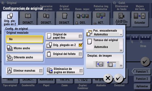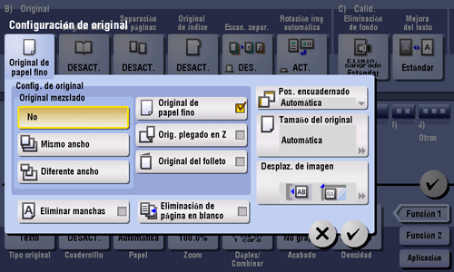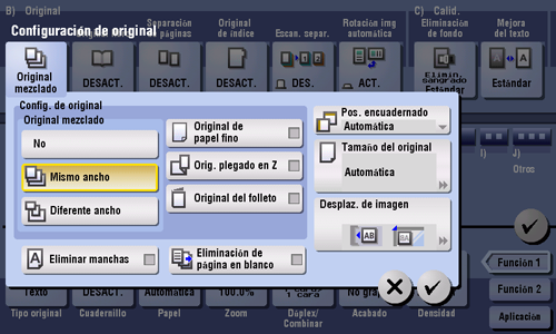 Incluso en originales con páginas de distintos tamaños, utilizando el alimentador automático de documentos puede escanear datos mientras se detecta el tamaño de cada página. Si los originales tienen el mismo ancho, seleccione [Mismo ancho]. Si los originales tienen anchos, diferentes, seleccione [Diferente ancho].