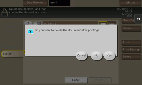 Drucken Sie eine Datei aus der Box. Geben Sie an, ob die Datei nach dem Druckvorgang in der Box verbleiben oder gelöscht werden soll.