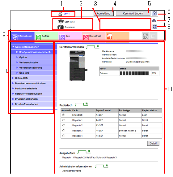 In diesem Beispiel werden die Abschnitte in den einzelnen Bildschirmen anhand der Elemente unter [Informationen] - [Geräteinformationen] beschrieben.