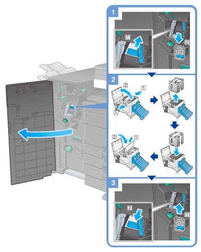 • Sie dürfen das Heftklammermagazin erst ersetzen, wenn die entsprechende Meldung angezeigt wurde. Wenn ein Heftklammermagazin ersetzt wird, bevor die entsprechende Meldung angezeigt wurde, tritt ein Fehler auf.